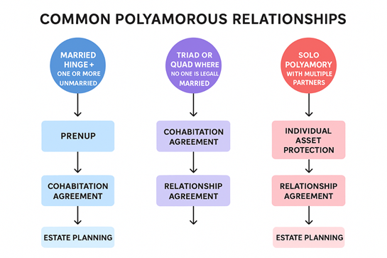 Polyamorous families come in many shapes. Each structure has its own legal and financial needs. Below are common scenarios and the type of planning that usually helps.