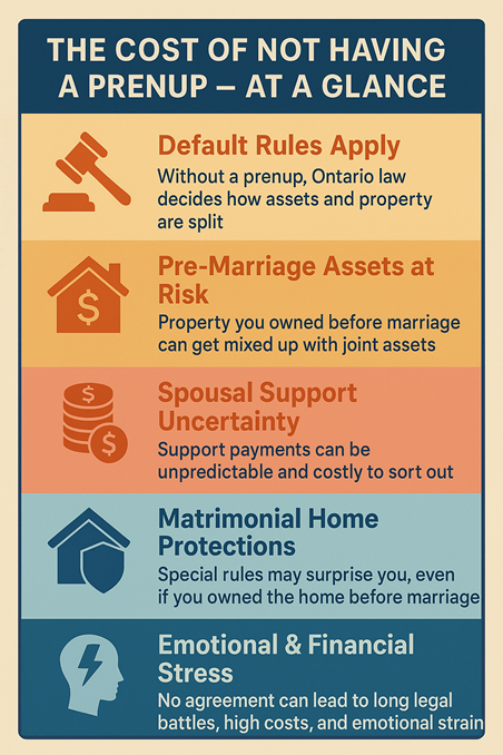 Marriage is about love, trust, and building a life together. But behind the romance, there’s a serious financial and legal side that many Ontario couples ignore. If you don’t have a prenup in Ontario, the law automatically decides how your money and property are split if you separate.