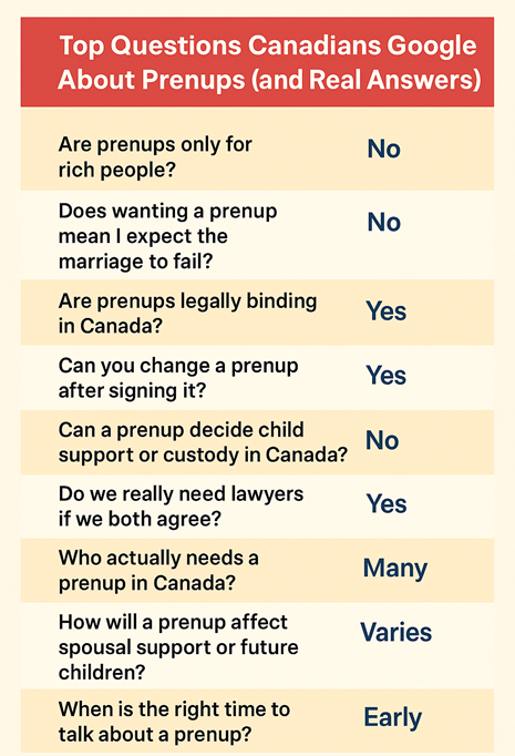Above all, there’s a lot of confusion: What exactly is a prenup? Does it even hold up in Canada? Why does every province seem to have its own rules? And why is the legal language so stressful? It’s no surprise Canadians keep turning to Google for answers.